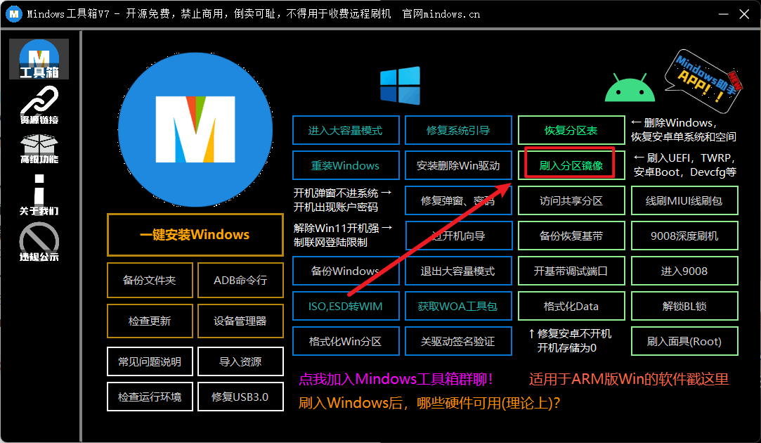 需要进入 win 系统,就需要刷入 相匹配的 uefi,需要进入安卓,就需要刷入相应的 boot 镜像,可以方便的通过 Mindows 工具箱中的刷入分区镜像功能来实现。