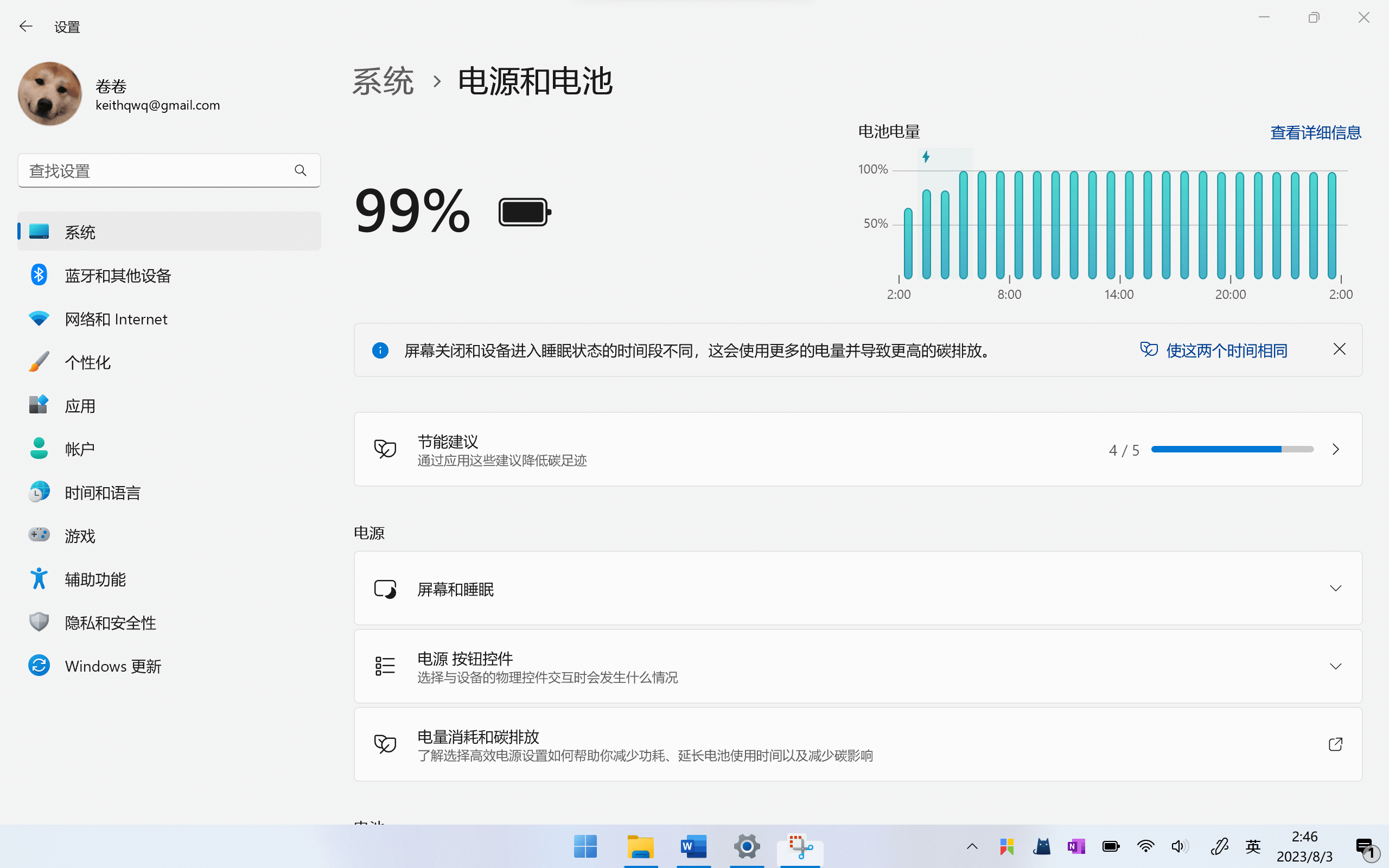 续航起飞,至少比我 2-3h 的游戏本好多了。我在早上 7 点从 90%左右电量的安卓切换到 win11,并开始安装软件,浏览网页,期间看了十几分钟视频,到了 10 点切换到安卓,还剩下 60%左右电量,并不严谨,但理论上这个续航还是不错的。